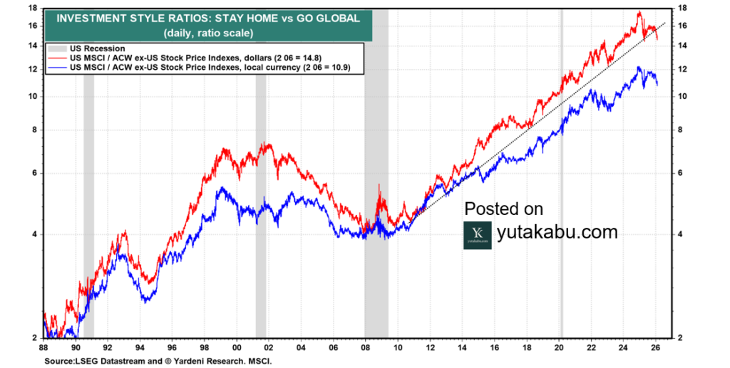 購買力平価モデル(PPP)をベースにしたドルインデックスの適正価値は赤線です。足元ドル安トレンドですが、加速する場合、まだまだ下落余地があることが分かります。26/1/29
