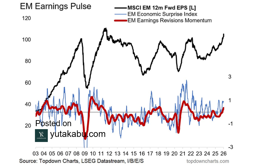 (チャート:地域別の自社株買いをした企業の割合)過去12か月間で1%以上の自社株買いを実施した企業の割合を示したチャートです。米国企業は株主還元に積極的で有名ですが、いまや専売特許ではありません。株主還元拡充ブームは、グローバルで広がっています。新興国市場ですら、その割合が増加しています。26/2/10