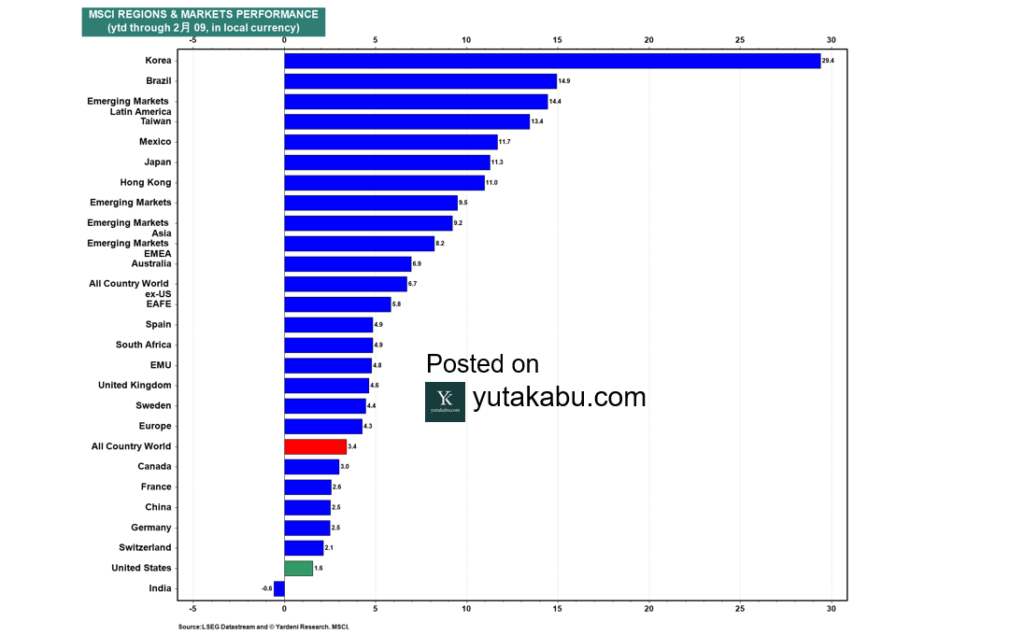 (チャート:S&P500EPSと韓国輸出額の対前年比)1月の韓国の輸出額は、半導体、コンピューター、自動車など13/15産業がプラスとなり前年比33.9%増と急増しています。韓国の輸出動向は、しばしば米企業利益の先行指標として機能します。もちろん炭鉱のカナリアとしても機能するので要注目です。26/2/6