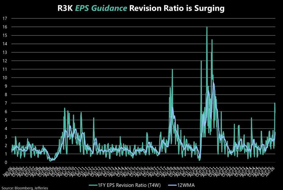 ラッセル3000の業績修正は、歴史的にみても高水準です。ファンダメンタル投資家にとっては、申し分ない状況であるのは明白です。逆張りの観点から見れば、業績修正のピークこそ、売り時かもしれません。判断は各自の大局観次第です。26/2/27