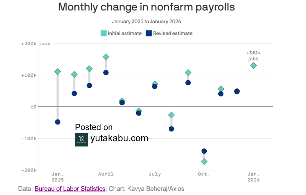 (チャート:米求人件数と求人率)12月の求人データは、ついに沈黙を破りさらに悪化しました。しかし同月の失業率は改善しています。これは、人手を増やさずとも労働市場は安定するということを示唆しているのでしょうか。26/2/6