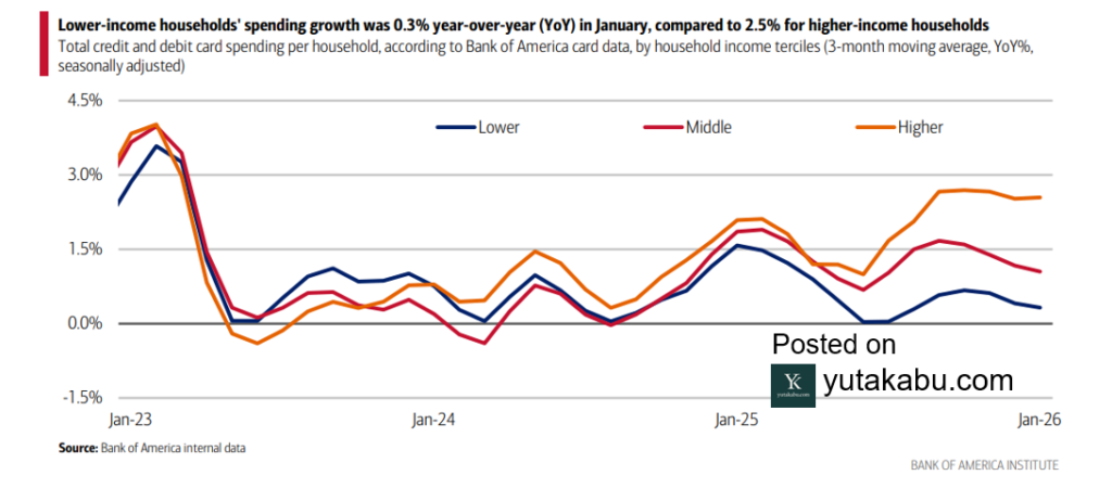 (チャート:ミシガン大消費者信頼感指数)株を保有している資本家のセンチメント(オレンジ)は改善している一方で、株を保有していない人のセンチメント(緑)は這いつくばっています。K字経済です。26/2/7