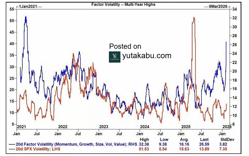 (チャート:半導体セクターvsソフトウェアセクター)情報技術セクター内で大きな乖離が発生しています。AI需要が追い風となる半導体サブセクターと、逆風となるソフトウェアサブセクターのパフォーマンスは、過去最大の差が開いています。これは歴史的逆張りチャンスなのでしょうか、それとも無謀な挑戦なのでしょうか。26/2/4