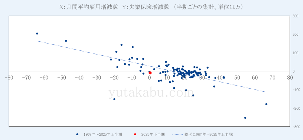 (チャート:ベバリッジ曲線)紫色に注目してください。去年8月以降、求人率は下がっても失業率は悪化していません。これは黄色の局面と同じような動きですが、もしかしたら失業率を安定させるために必要な求人率は、著しく低下しているのかもしれません。26/2/6