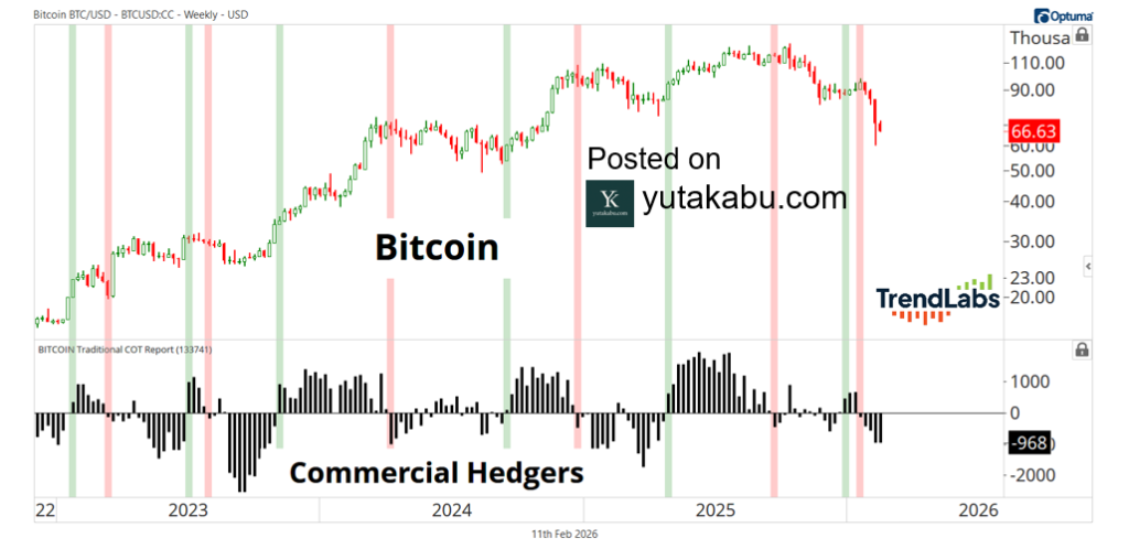 (チャート:ビットコイン価格と平均購入価格)ビットコイン価格はついに、現物ETF保有者の平均取得価格を下回り、ETF購入者は含み損を抱えている状況です。投資家はナンピン買いへと行くのか、パニックに陥るのか、重要な局面を迎えています。26/2/3