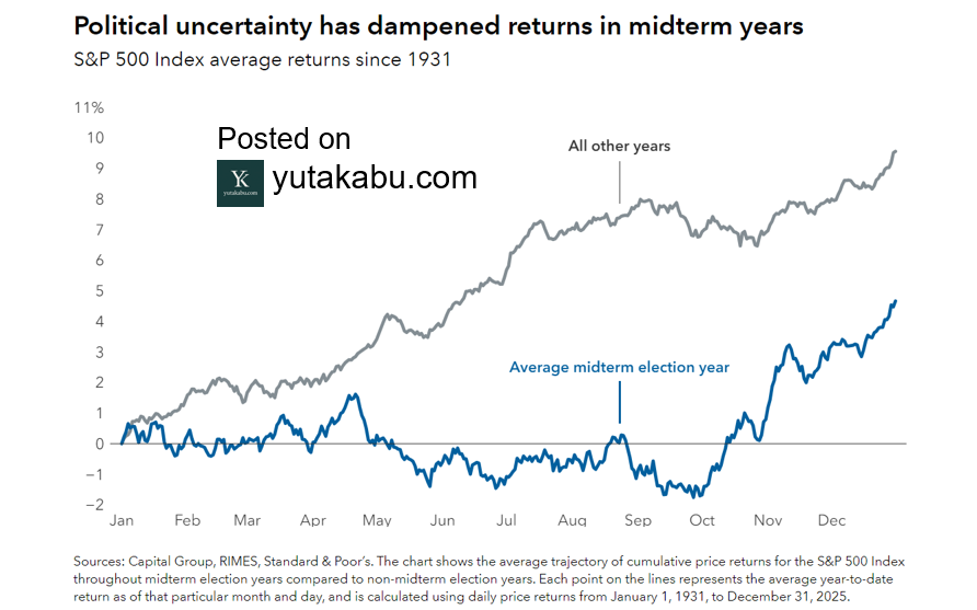 (チャート:S&P500の平均株価推移)中間選挙の年(青線)は、選挙前まで上値を抑えられ、選挙直前から年末にかけて上昇する特殊な季節性があります。中間選挙の年にこのような特徴がある理由は非常に単純で、市場は不確実性を嫌うからです。26/2/16