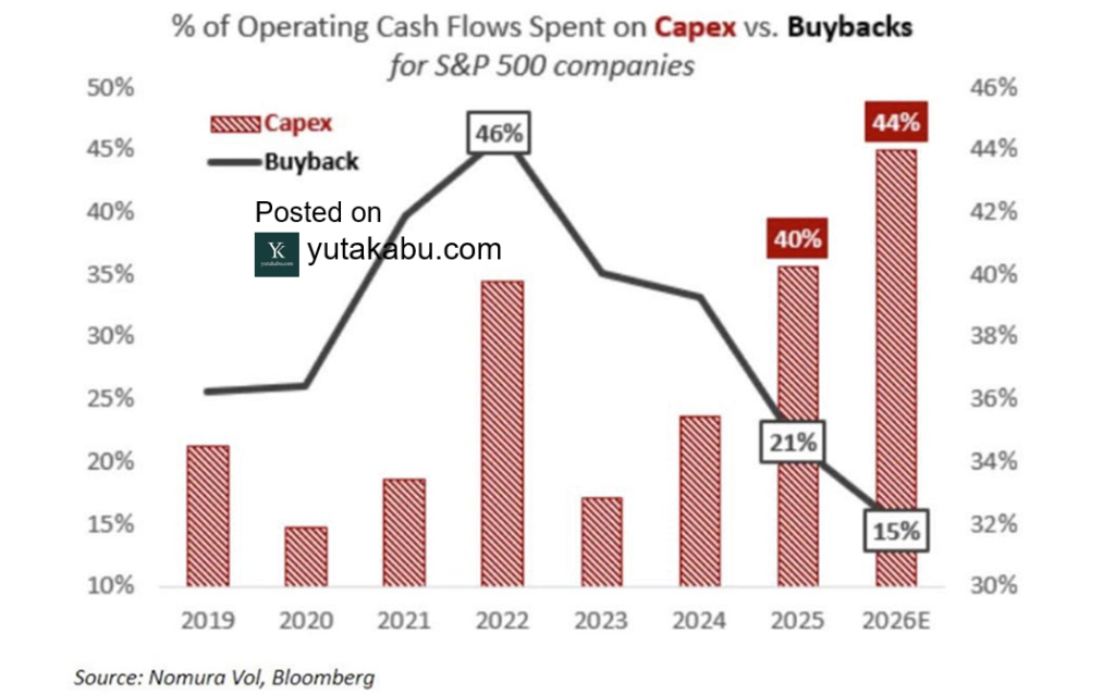 (チャート:S&P500の営業キャッシュフローに占める割合)設備投資の割合は増え、自社株買いの割合は減少しています。自社株買いはリターンの源泉です。AI競争の激化によって、今年は自社株買いの資金は設備投資に回されてしまうわけなんですが、今年一年でみれば、これは投資家にとってはネガティブです。後は、この過剰そうに見える設備投資が、将来の利益をもたらしてくれることを願うしかありません。26/2/16