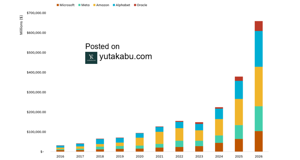 (チャート:ハイパースケーラーの設備投資)ハイパースケーラー5社、マイクロソフト、メタ、アマゾン、グーグル、オラクルの2026年の設備投資額は6000億ドルを超える見通しです。設備投資が増えることは経済にとっては良いことなんですが、問題は、キャッシュフローが限られているということです。設備投資を加速させるために、他に使う資金を削る必要があることを忘れないでください。26/2/16