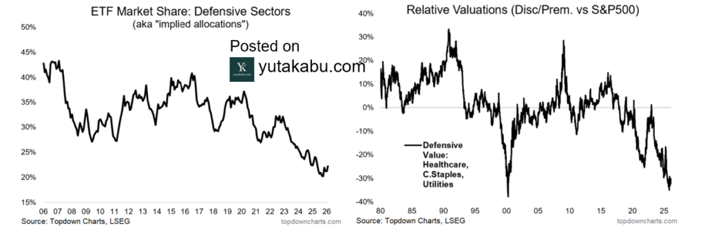 (チャート:ディフェンシブセクターのETFマーケットシェアと相対バリュエーション)ディフェンシブセクター(ヘルスケア、生活必需品、公益)は今年に入って市場をアウトパフォームし始めていますが、ETFのマーケットシェアで見ても、相対バリュエーションで見ても、依然割安であり放置されています。26/2/16