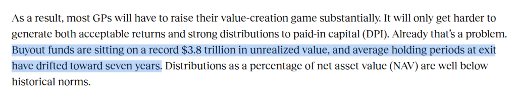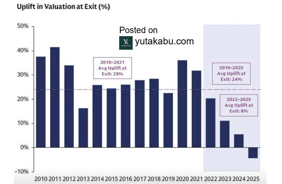 (チャート:エグジットのパフォーマンス)プライベートエクイティ市場は不況にさらされています。エグジット時のバリュエーション上昇率は、ついにマイナスに転じています。安定的に高リターンを記録できる時代は終わりを迎えたのかもしれません。26/2/16