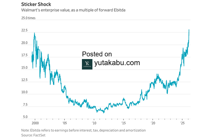 (チャート:ウォルマートのEBITDA)ディフェンシブ銘柄の本命、ウォルマートの株価は過剰に評価されています。EBITDAは2000年の高値を上回り、バブル耐性すら失っているように思えます。個人的に大好きな銘柄ですが、もはや高嶺の花です。26/2/18