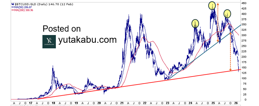 (チャート:ビットコイン価格/金価格 相対指数)ビットコインと金の相対価格は、ついに重要なトレンドライン(抵抗線)に到達したようです。ビットコインと金のトレードオフは発生するのでしょうか、これは見物するのがベストでしょう。26/2/18
