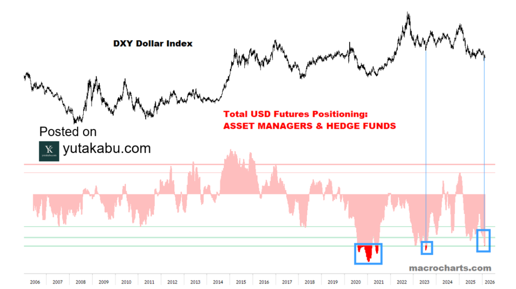 (チャート:ドルインデックスとドルポジション)機関投資家のドルポジションは足元非常に弱気であり、水準としては2023年の弱気以来のショートポジションとなっています。個人的に、ドル安トレンドは長期的なものだと考えていますが、ポジションの偏りは懸念です。というのも、もし割と大きなドル高材料が出てきたとしたら、この偏ったドルショートポジションが一気に解消されることになるからです。26/2/18