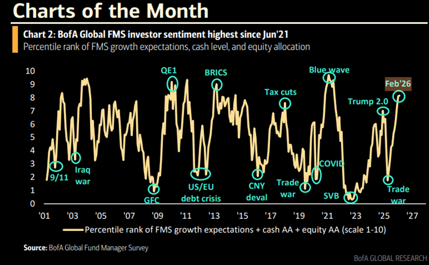 (チャート:BofA投資家センチメント)バンクオブアメリカのグローバルファンドマネージャー調査によると、グローバルファンドマネージャーのセンチメントは、ついに2021年6月以来の高水準に上昇しています。センチメントを把握するのは、その後の株価調整の幅を知るためです。センチメントが強気、ブルであればあるほど、もし相場を反転させるような大きな材料が出れば、その後の調整はより深くなります。26/2/18