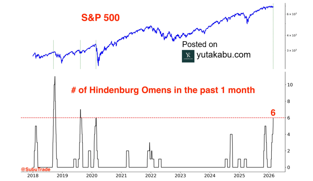 ここ1か月で、S&P500にヒンデンブルクオーメンが6回点灯しています。個人的には、このヒンデンブルクオーメン、クラッシュを予測する指標というよりかは、相場の転換点を予測する指標として見ています。前回5回点灯した去年末は、大規模なローテーションを示唆するものとなりました。26/2/27
