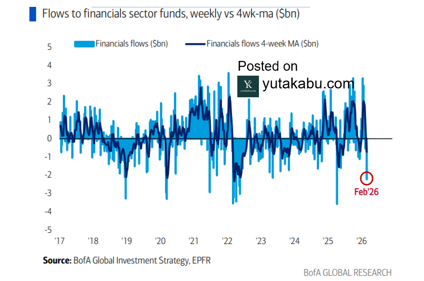金融セクターファンドのフローは、相互関税発表の昨年4月以来の資金流出を記録しました。つられて売られている強気のサブセクターは買い場かもしれません。私は銀行サブセクターに注目しています。26/3/1
