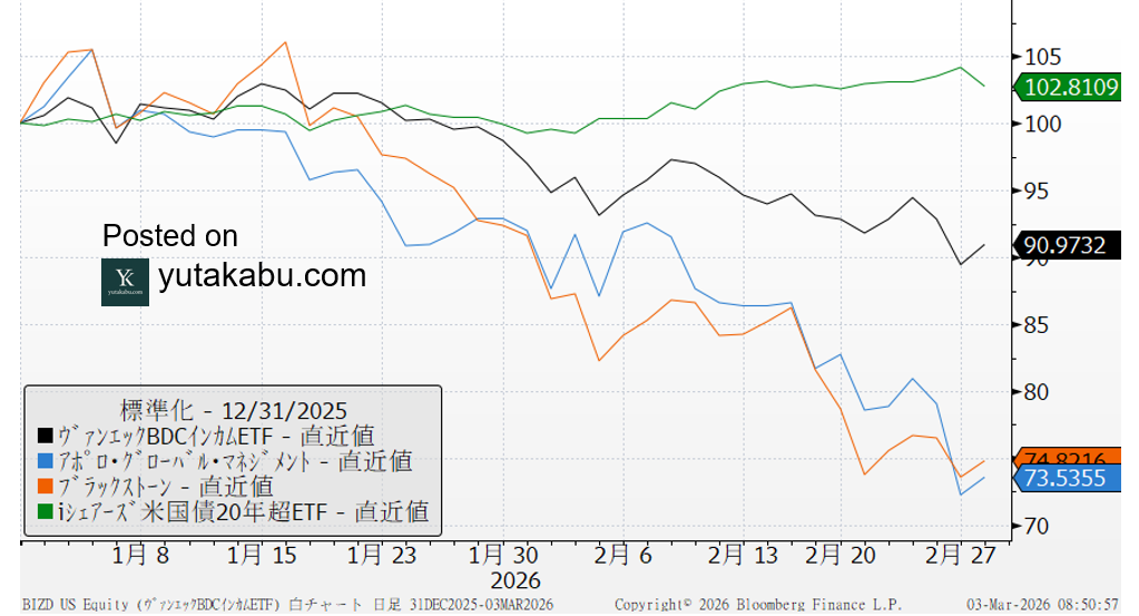 年初来で見ると、BDCのETFは10%下落、プライベートクレジット、プライベートエクイティといえばのアポロやブラックストーンは年初来で30%弱下落しています。ちなみに、これら3銘柄とも、去年4月の解放記念日の安値を下回っています。最大の金融リスクとして警戒してください。26/3/3