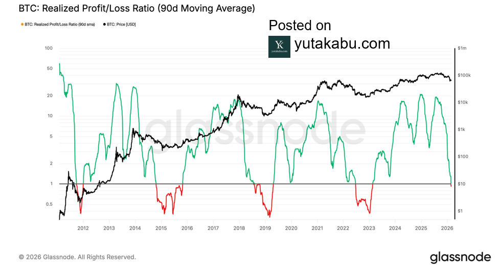 実現損益比率は1を下回りました。つまり、損失実現が利益確定を上回って、超過収益ではなく超過損失相場へと移行したということです。これまでのサイクルを振り返ると、実現損益比率は1を下回る水準が6か月以上続きます。そして、この実現損益比率が1を回復してくると、ビットコイン相場は再び強気相場を迎える傾向にあります。26/3/3