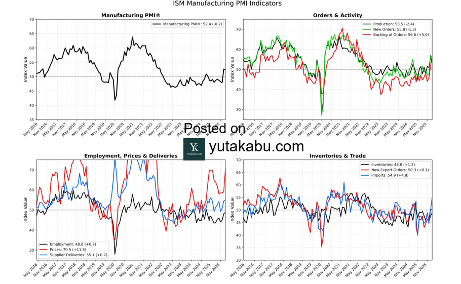 ISM製造業景況感指数が2月も拡大圏を維持したことは非常に喜ばしいことなのですが、合わせて価格指数が跳ね上がっているのが懸念点です。26/3/4