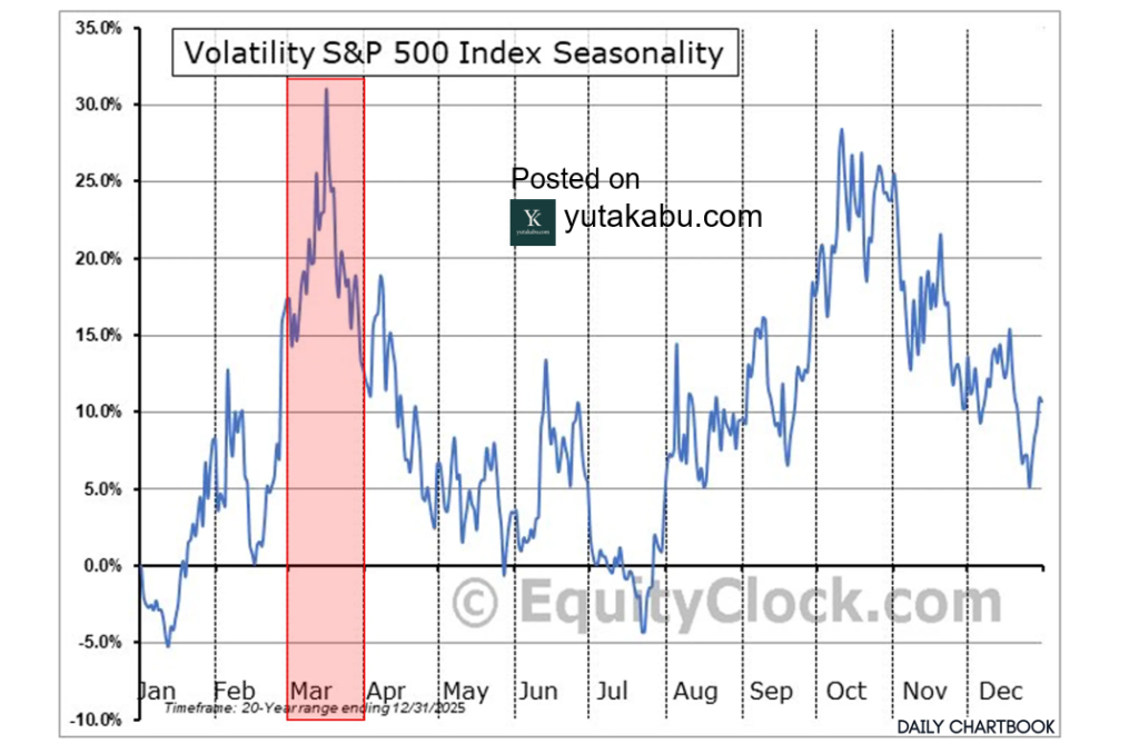S&P500は、3月にボラティリティが上昇しやすい季節性にあるわけですが、今年もそうなりましたね。こういった季節性は、侮れないデータです。26/3/5