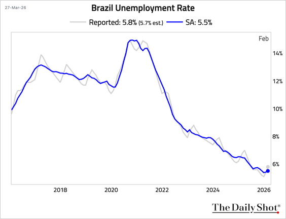 ブラジルの失業率は低下傾向です。26/3/31