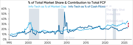 フリーキャッシュフローでみると、情報技術セクターの市場シェアはそこまで高くありません。時価総額シェアとの乖離が広がっており、投資が失敗した際のリスクが鮮明となっています。 26/3/31