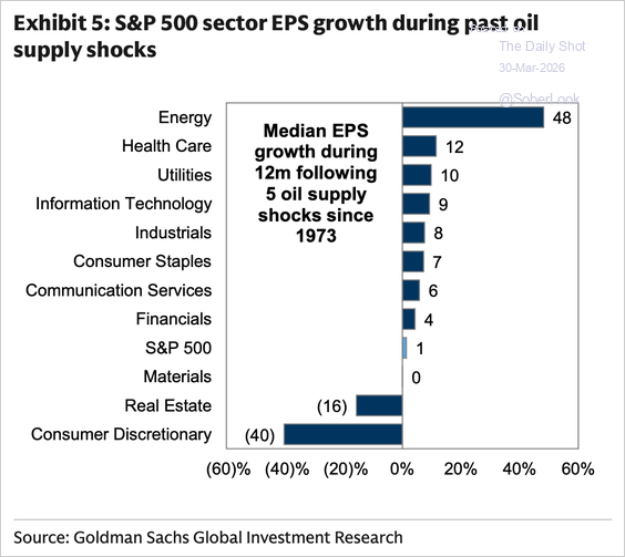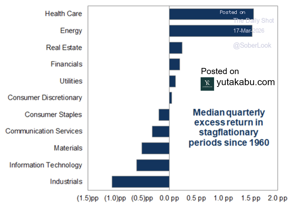スタグフレーション下では、ヘルスケアとエネルギーセクターがアウトパフォームする傾向にあります。一方で、資本財と情報技術セクターはアンダーパフォームする傾向にあります。26/3/18
