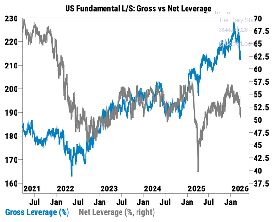 ロングショートヘッジファンドは、グロスレバレッジもネットレバレッジも落としています。26/3/31