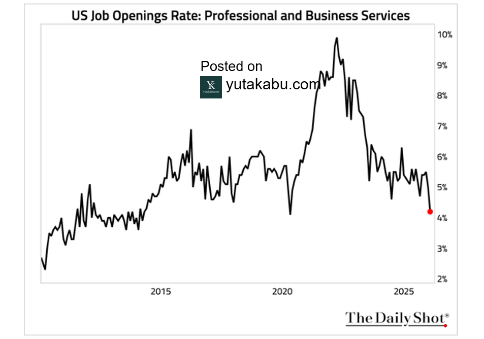 専門職およびビジネスサービスの求人率は、2020年4月以来の最低水準となっています。これはAIによる影響でしょうか。26/3/17