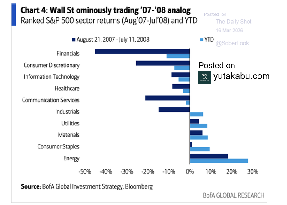 セクター別パフォーマンスを見ると、足元は2008年のリーマンショック前と同じ動きをしていることが分かります。26/3/18