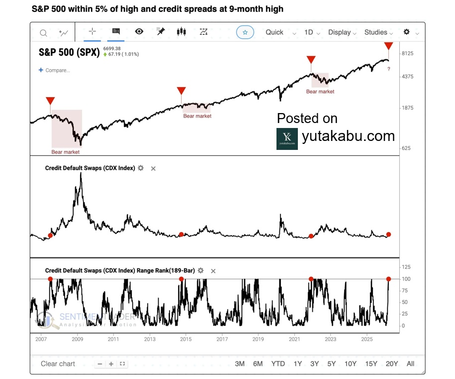 足元、S&P500が高値から5%以内しか下落していないなかで、クレジットスプレッドは9か月高値に到達しています。過去のデータを見ると、これはベア相場入りのサインです。26/3/18