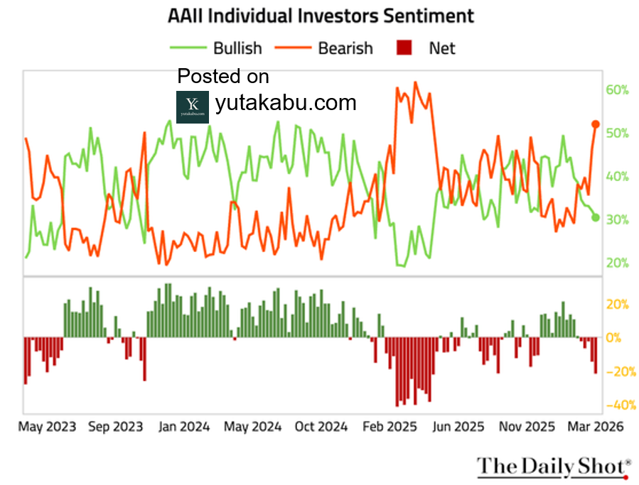 AAIIブルベアスプレッドは、-20%を下回りました。個人投資家は、急に悲観的になっています。26/3/22