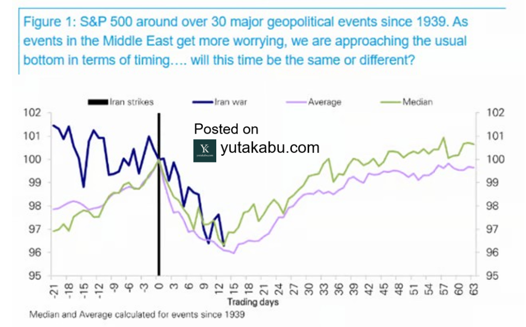 ドイツ銀行によりますと、地政学ショックから15日後に、株価は底をつくのが歴史の平均なようです。26/3/22