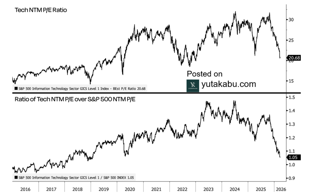 情報技術セクターのPEGレシオは、5年ぶりの安値近辺まで調整しています。長期投資家としては狙い目かもしれません。26/1/30