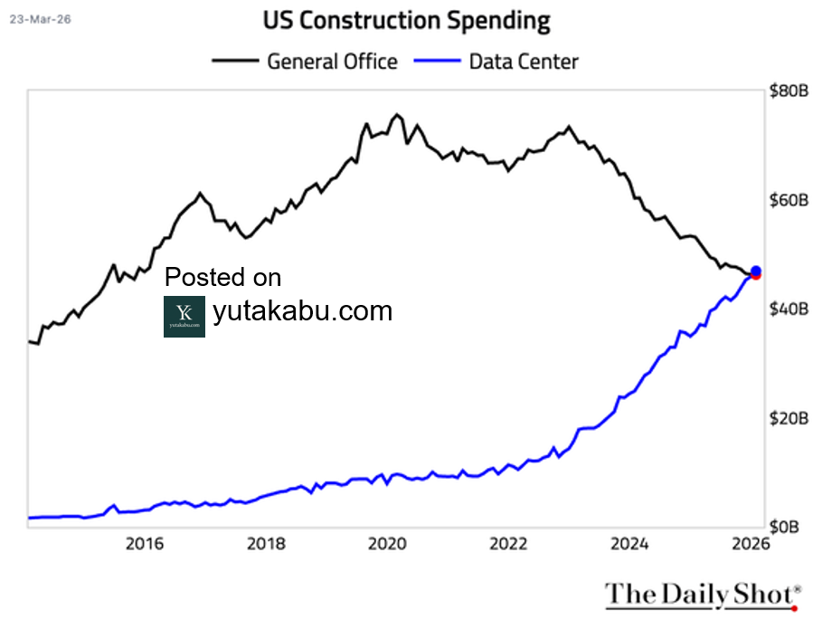 人間が働く場所より、AIが働く場所に、資本が向かっているのは周知の事実ですが、ついに絶対額も入れ替わりました。26/3/26