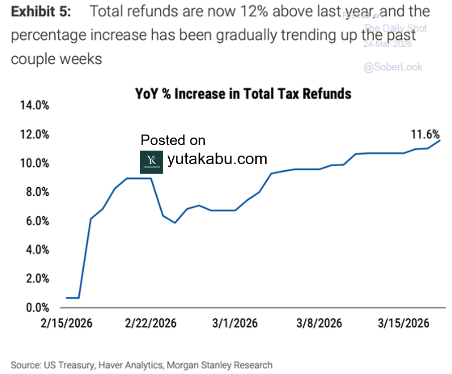トランプ減税によって、税金還付金は12%増加しています。原油価格急上昇で、すべて相殺されました。26/3/26