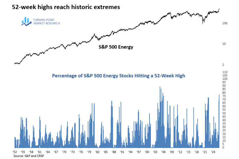 エネルギーセクターの77%が52週高値に到達しました。これは、2004年から2005年にみられた強気相場以来の水準です。コモディティスーパーサイクルを示唆しているのでしょうか。26/3/31