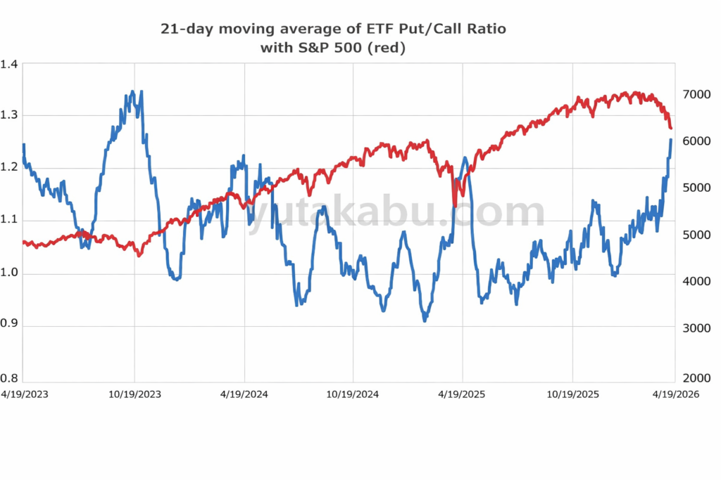ETFのプットコール比率の21日移動平均は、関税騒動の時よりも高くなっています。26/4/1