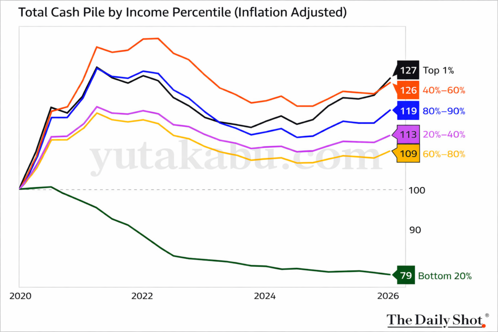 インフレ調整後の現金積立の推移ですが、所得下位20%の層は、現金を切り崩しているようです。サブプライムまわりのショックに気をつけてください。26/4/1