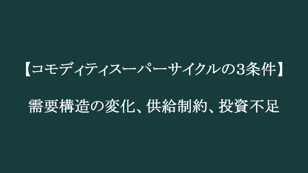 コモディティスーパーサイクルというのは、10年、下手したら20年スパンで続く、資源価格の構造的な上昇局面のことです。これをもたらすのは、構造的需要ショックと供給の遅れによる「需給ギャップ」です。
