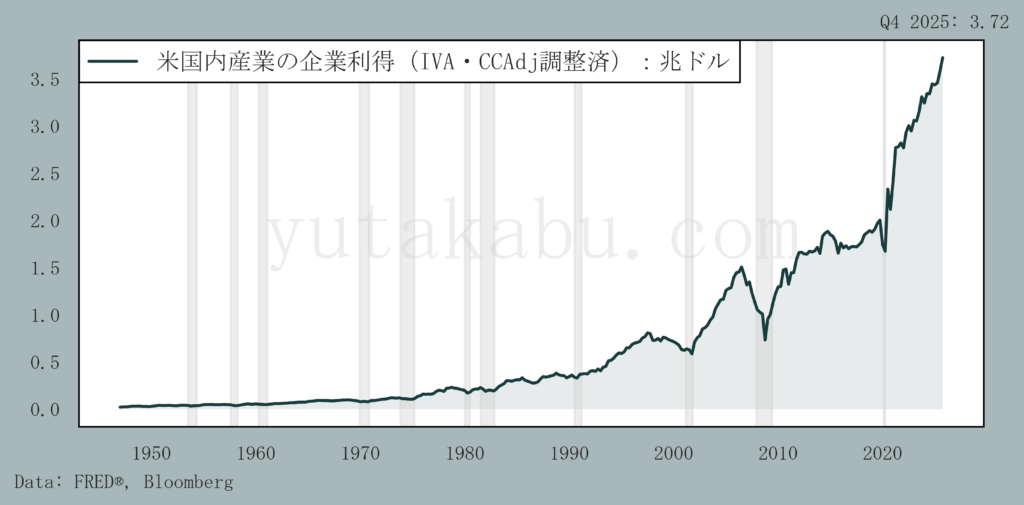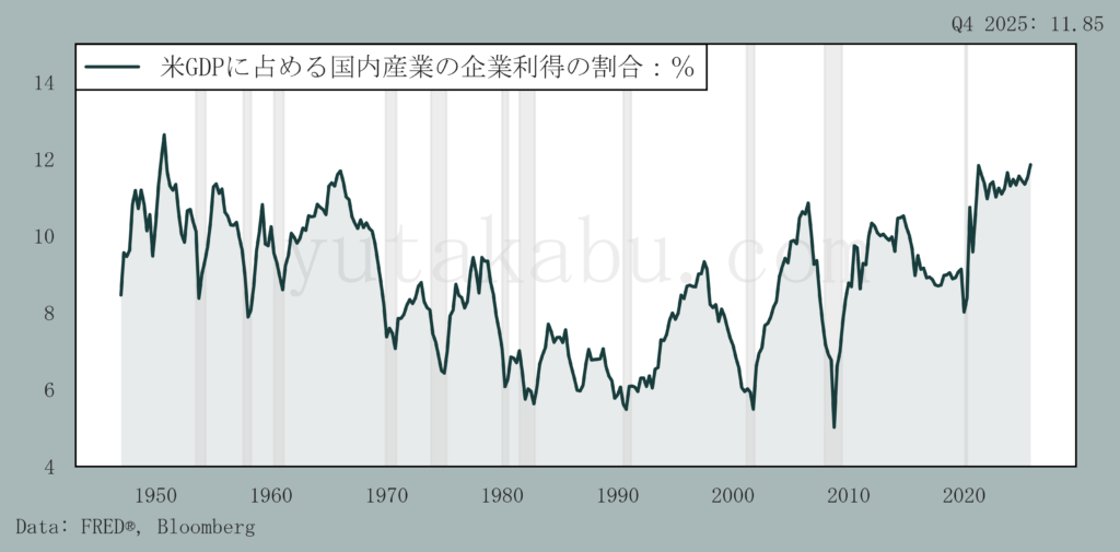米国のGDPに対する企業利得の割合は過去最高水準です。26/4/11