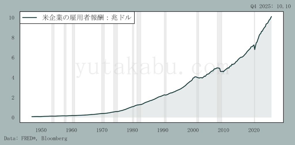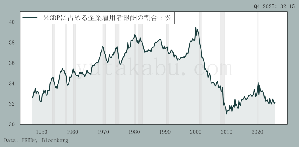 一方で、米国のGDPに対する雇用者報酬の割合は過去最低水準です。26/4/11