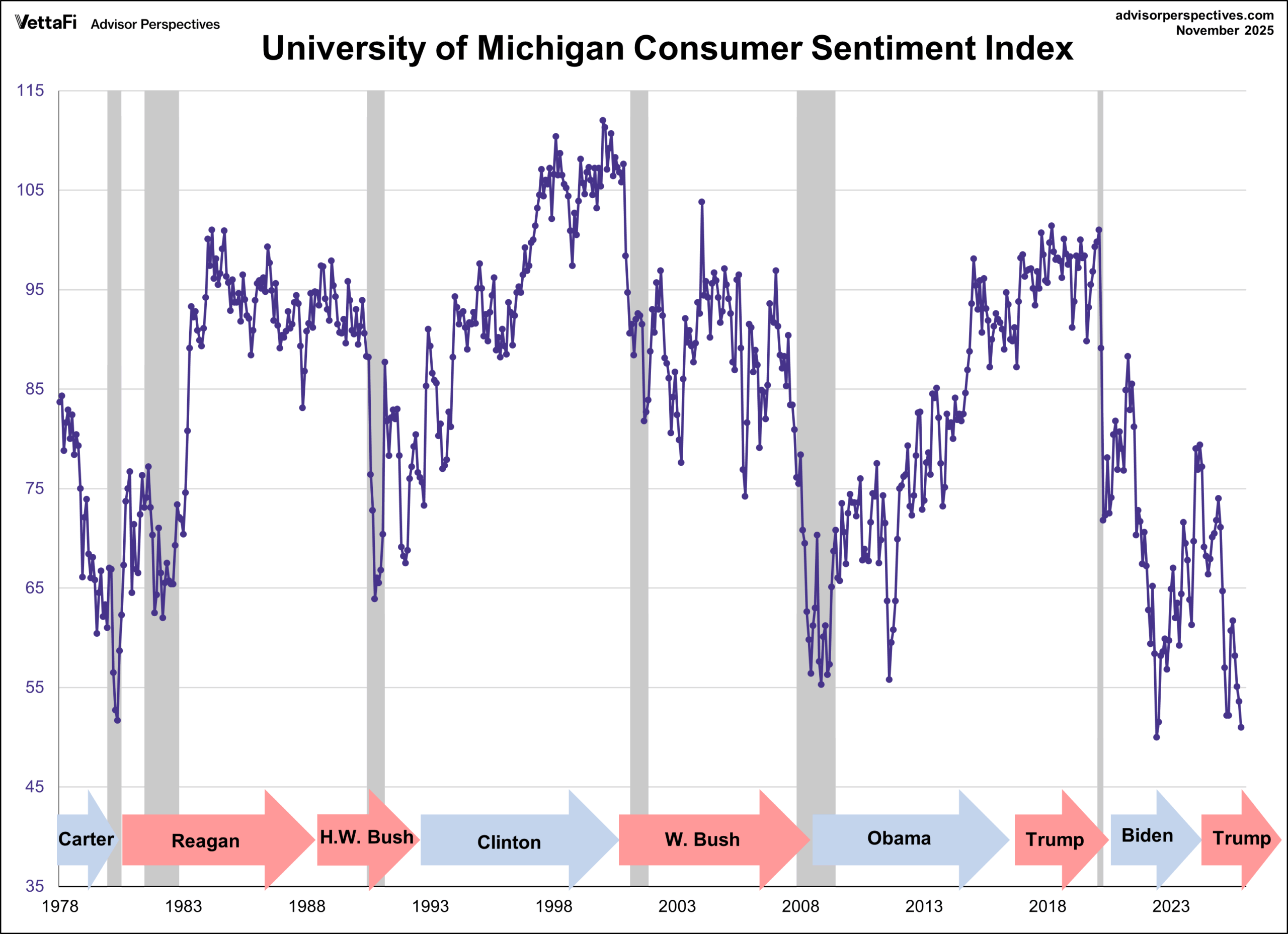 一つ目の問題は、消費者の気持ちです。こちらのチャートは、アメリカのミシガン大が公表している消費者センチメント指数です。チャートを見てみると、直近5年ほど低水準で推移しているのが分かると思います。なんなら過去最低水準です。これは、まごうことなき物価高の賜物です。異常な物価上昇によって膨れ上がった生活コストや、手を出せない住宅市場に対して、消費者のフラストレーションは溜まりに溜まっているということです。