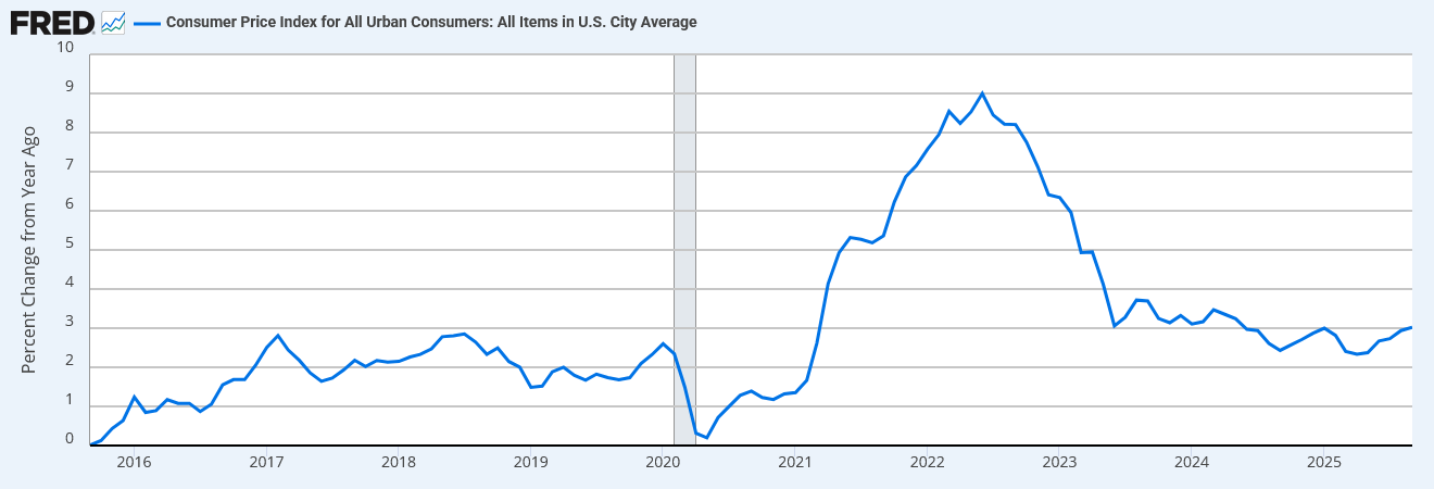 まずは、みなさんと認識をそろえるために、アメリカのインフレおよび政府債務の状況と、その問題点について確認していきたいと思います。今お見せしているのは、アメリカの消費者物価指数CPIの前年同月比チャートです。直近10年間のデータを表示しています。チャートを見てみると、2021年以降、インフレ率は、FRB目標の2%を大きく上回って推移しているのが分かると思います。そして足元も3%上昇と高止まりしています。