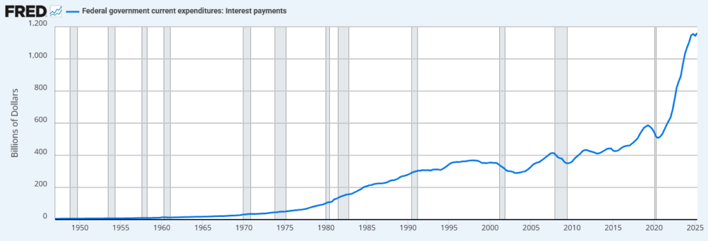 こちらのチャートは、アメリカ政府の年換算された利払い費の推移です。チャートを見てみると、ここ数年で利払い費は倍増しているのが分かると思います。なぜかというと、金利が高いからです。当たり前ですが、アメリカ政府は毎年、債務残高の一部を借り換えなければいけませんし、新しい財政赤字の分の国債も追加発行しなければなりません。それらはすべて、新しい金利のもと発行されます。