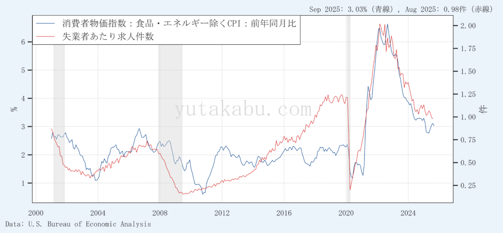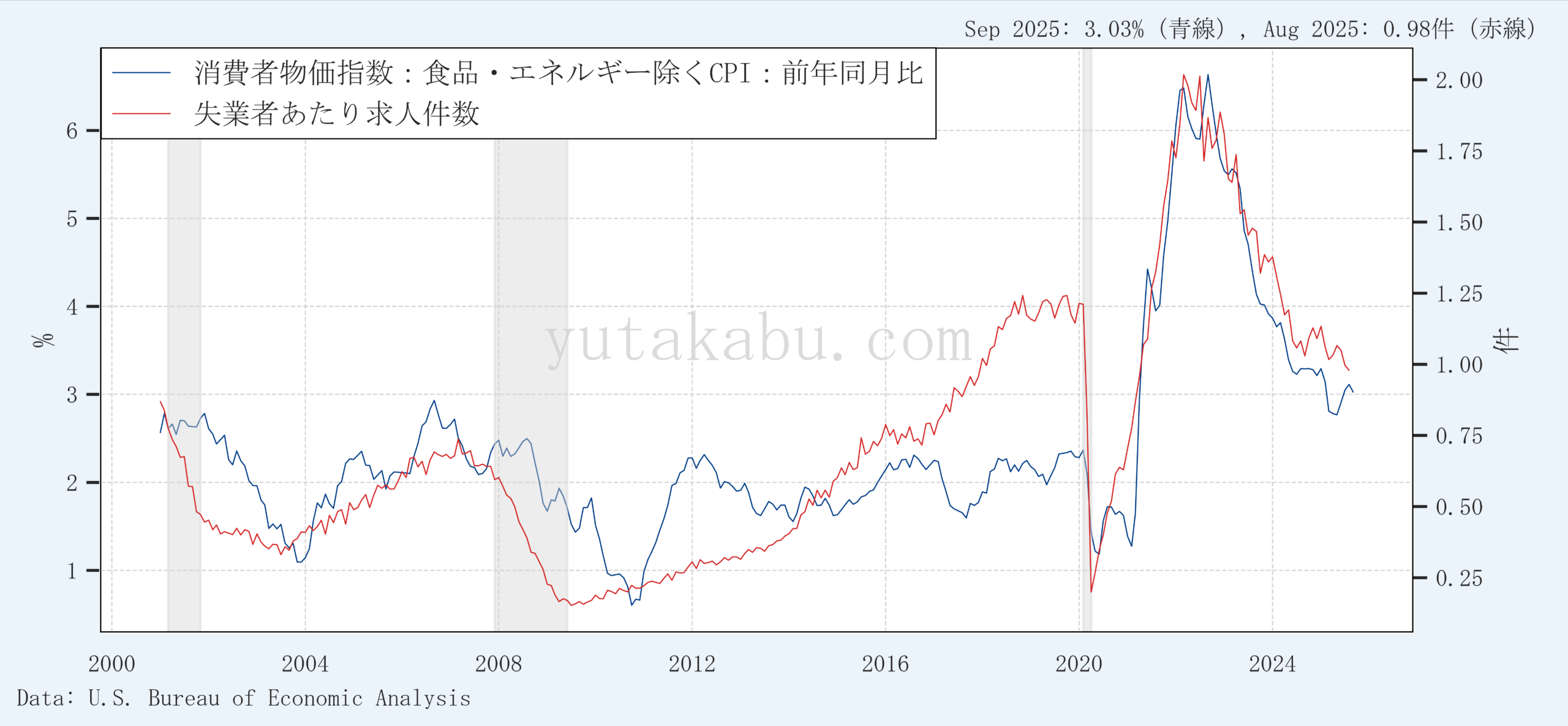 こちらのチャートをご覧ください。青の線グラフが食品エネルギー除くコアCPI、赤の線グラフが失業者あたりの求人件数です。ふたつのグラフを比較してみると、両者は同じようなトレンドを描くことが分かると思います。つまり、労働力の需給とインフレ率は、高相関の関係にあるということです。これは経済の基本です。FRBもこの考えのもと、政策判断を行っています。AIとロボットは、うまくいけば、労働力需給を大きく緩和させます。悪く言えば、人間の労働力を必要としなくなります。そうなれば、このチャートが示すように、インフレ率は低下していくということです。