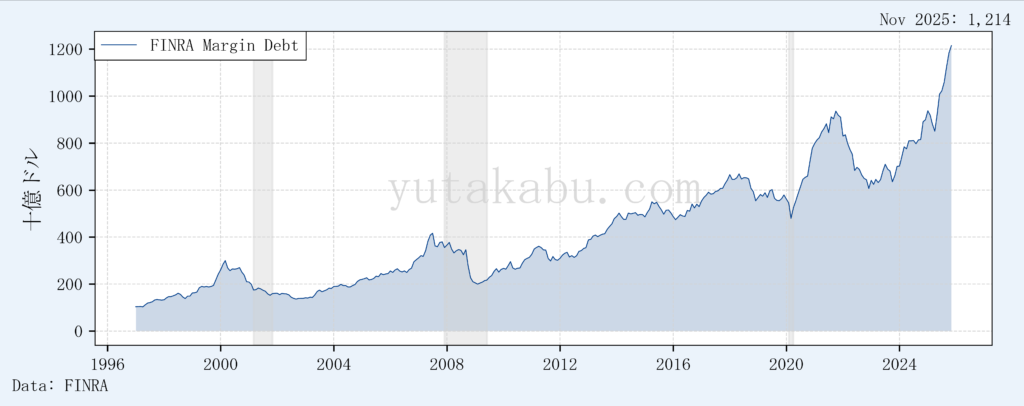 まずはこちらのチャートをご覧ください。これは、米国株式市場における信用取引残高(マージンデット)の時系列チャートです。米国の証拠金債務は11月に前月比2.6%増加し、ついに1.2兆ドルを突破して過去最高水準を更新しました。これで7か月連続の増加となり、投資家がレバレッジをかけた取引を積極的に拡大している状況にあります。一般的にマージンデットの増加は、相場に対する強い楽観心理を反映するとされますが、過度に積み上がった局面では調整局面の前兆となることも少なくありません。足元の投資家センチメントは異常とも言えるほど強気であり、市場の過熱感には注意が必要だと言えると思います。