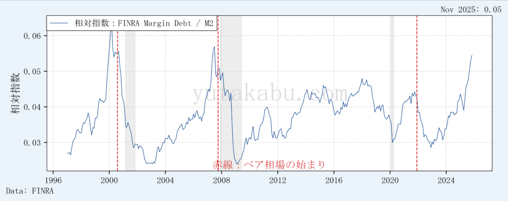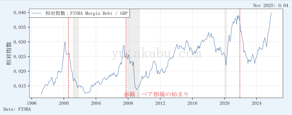 続いてこちらは、先ほど確認した米国株式市場の信用取引残高を、名目GDPで割って算出した相対指数です。単なる金額の増減ではなく、実体経済の規模に対して、どの程度のレバレッジが市場に積み上がっているのかを示す、投資家にとって重要な指標と言えます。GDPに対する信用取引の規模は、ついに過去最高水準を更新し、米国金融市場の過熱感が一段と強まっていることを示唆しています。チャート上の赤線は、過去に長期的なベア相場へと移行したタイミングを示しています。仮に歴史が繰り返されるのであれば、ベア相場入りする前に、GDPに対する信用取引は大きく縮小することになります。長期投資家にとっては、市場の転換点を見極めるうえで、毎月欠かさずチェックすべきチャートであるのは間違いありません。