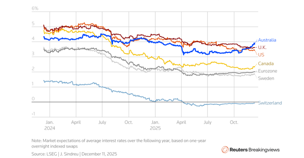 続いてこちらは、市場に織り込まれている各国の「1年先の予想政策金利」を示したチャートです。今年前半までは、利下げ・金融緩和期待がグローバルで広がっていました。しかし、年後半に入ってからはその流れが明らかに鈍化しており、市場の見方に変化が生じていることが分かると思います。特に注目すべきは青線で示されたオーストラリアです。これまでの緩和方向への期待から一転し、金融政策の期待感がほぼ180度転換し、引き締め方向へと市場の予想が修正されています。グローバルでの金融緩和期待は、ここ数年にわたり株式をはじめとするリスク資産価格の上昇を後押ししてきました。しかしその材料も失われつつあります。オーストラリアの金融政策の転換が引き金になるとまでは言いませんが、投資家として注意すべきリスクであることは言うまでもありません。EUのシュナーベル理事は最近、次の一手は利上げになると断言していました。ぜひ注目してください。