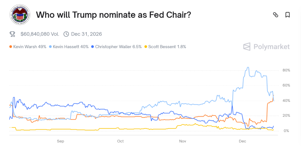 続いてこちらは、次期FRB議長が誰になると思うか、賭け市場(ポリーマーケット)におけるオッズを示したチャートです。直近、期待を大きく集めたのは、オレンジ色のケビン・ウォーシュ氏です。ついに、ほぼ決まりだと思われていたハセット氏を上回りました。トランプ大統領がふたりのケビンで悩んでいるというニュースは、みなさん目にしたかと思います。以前動画で、ケビンウォーシュ氏の金融政策への考え方について説明しましたが、もしウォーシュ氏がFRB議長となれば、金融政策の根本的な考え方が変わる可能性があります。簡単に言えば、マネタリズムの考え方が導入されるかもしれないということです。いずれにせよ、どちらのケビンになっても利下げは主張されることになりますし、FRBの独立性に対する市場からの疑いは深まります。ハセット氏よりもウォーシュ氏の方が、独立性の観点でいえば、まだマシかもしれません。新しい議長の下での金融政策の変化というのは、来年の相場の一大テーマです。中間選挙と合わせて二大テーマです。定期的に解説していきます。